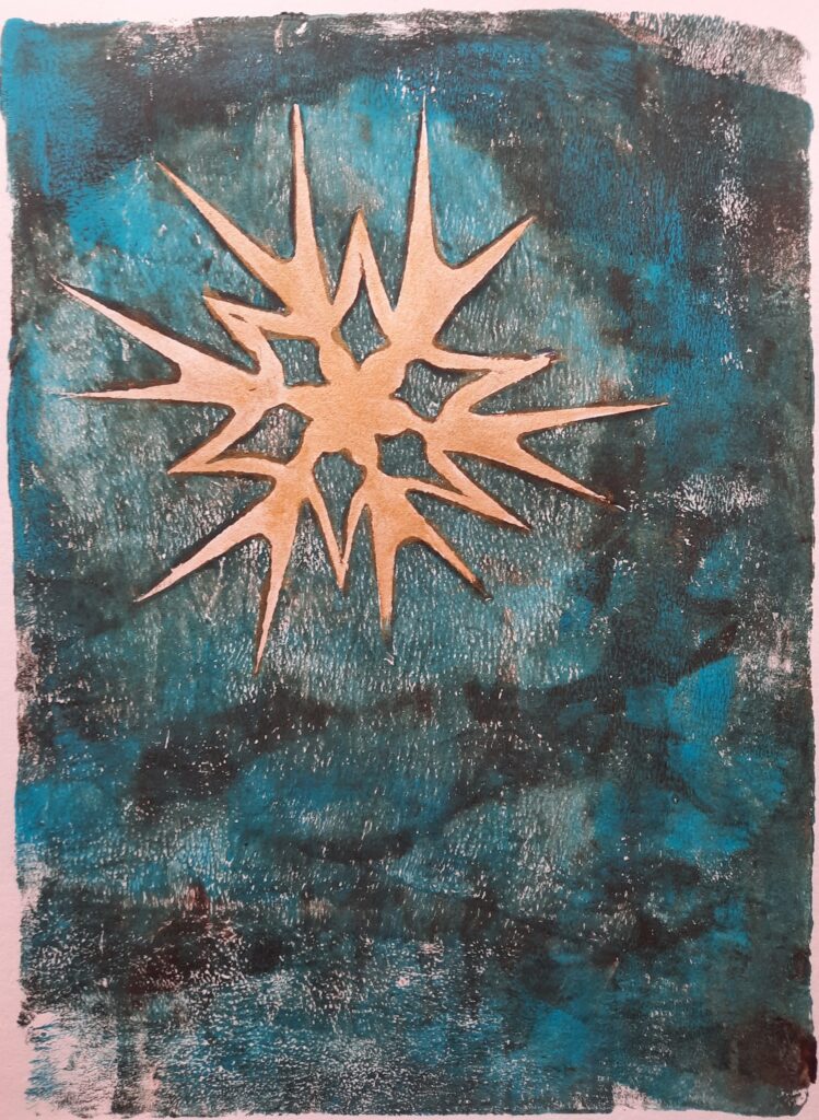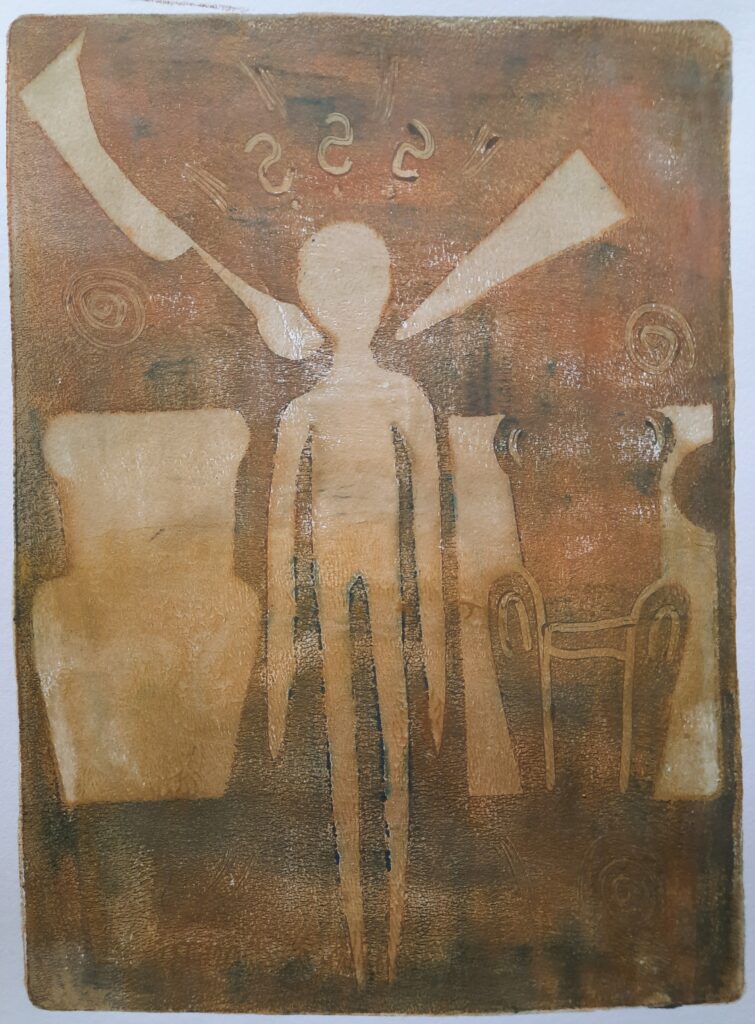 ZLATÉ ČASY, kombinovaná technika, akryl na lepence, bábovka ze sádry, klíč, talíř, 2023