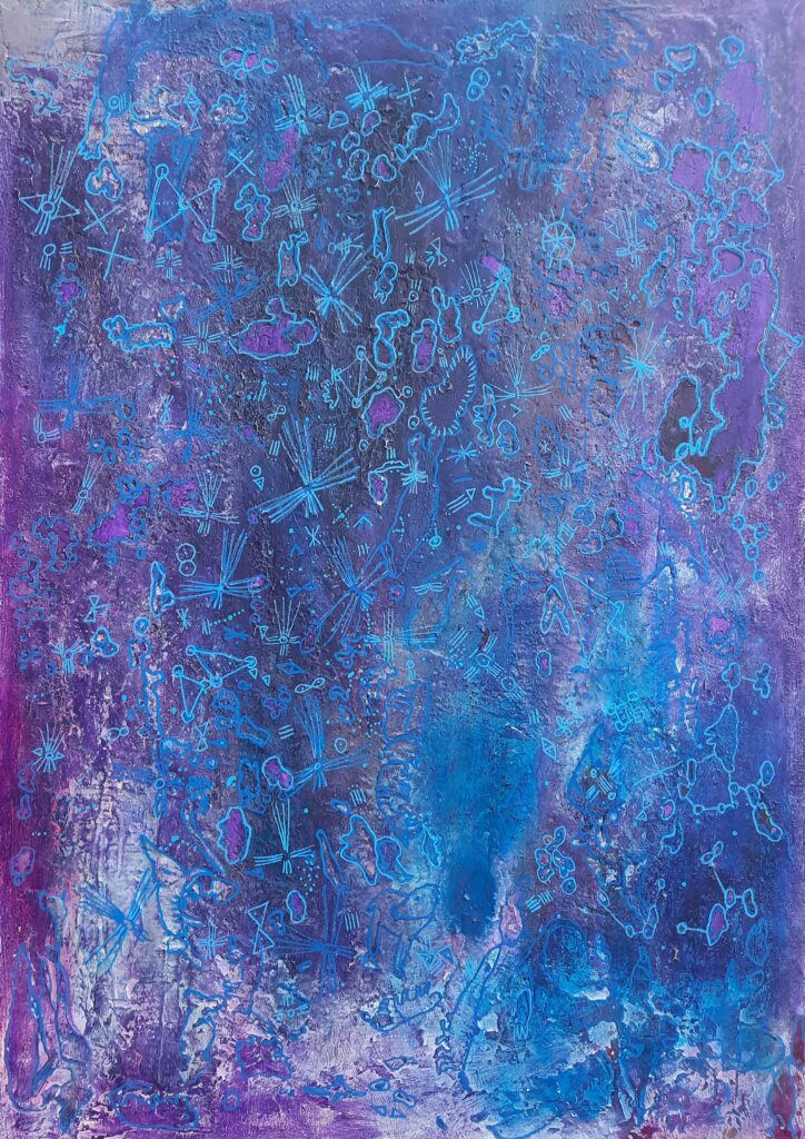 NĚCO SE DĚJE, akryl na plátně, kombinovaná technika, 100 x 120 cm, 2021.